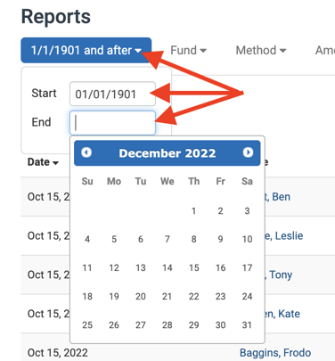 If you want all transactions ever, make sure no filters are applied for date. If you need only a subset (specific date range, fund, or campaign), apply the filters accordingly.
