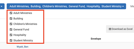 At the top, use the Filters (date range, funds, campuses, payment source, etc.) if you want to narrow it down. To get all donations ever, set the date range to cover the full span of your records.