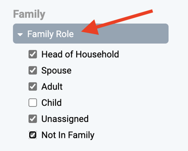 Family Role: Select all family roles except those that represent children and youth under the age of 18 and non-primary household members (e.g., live-in grandparents).